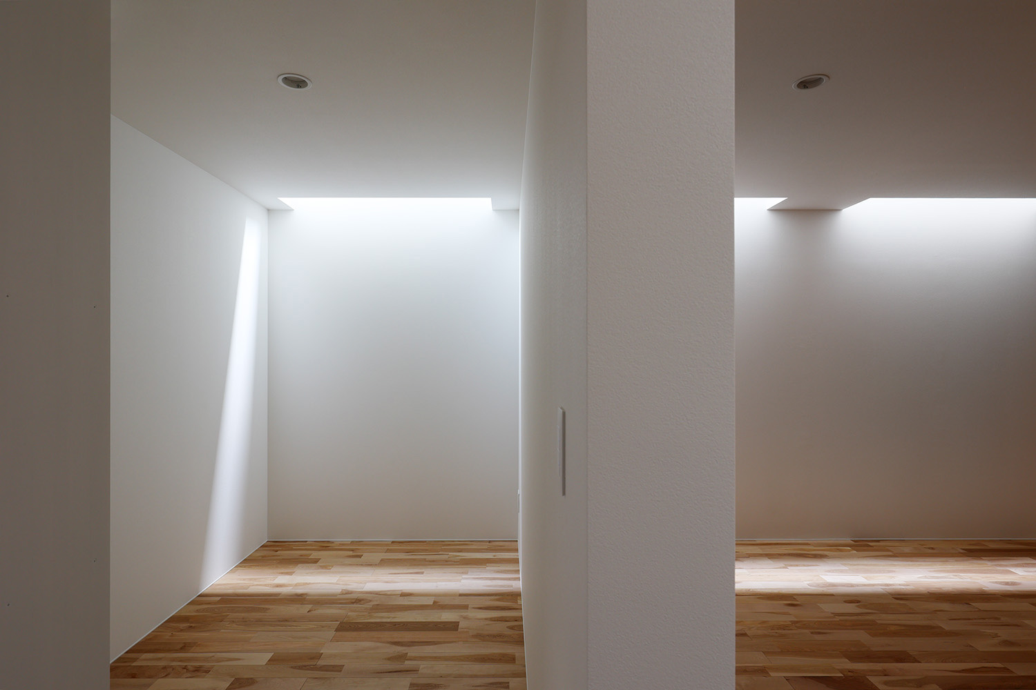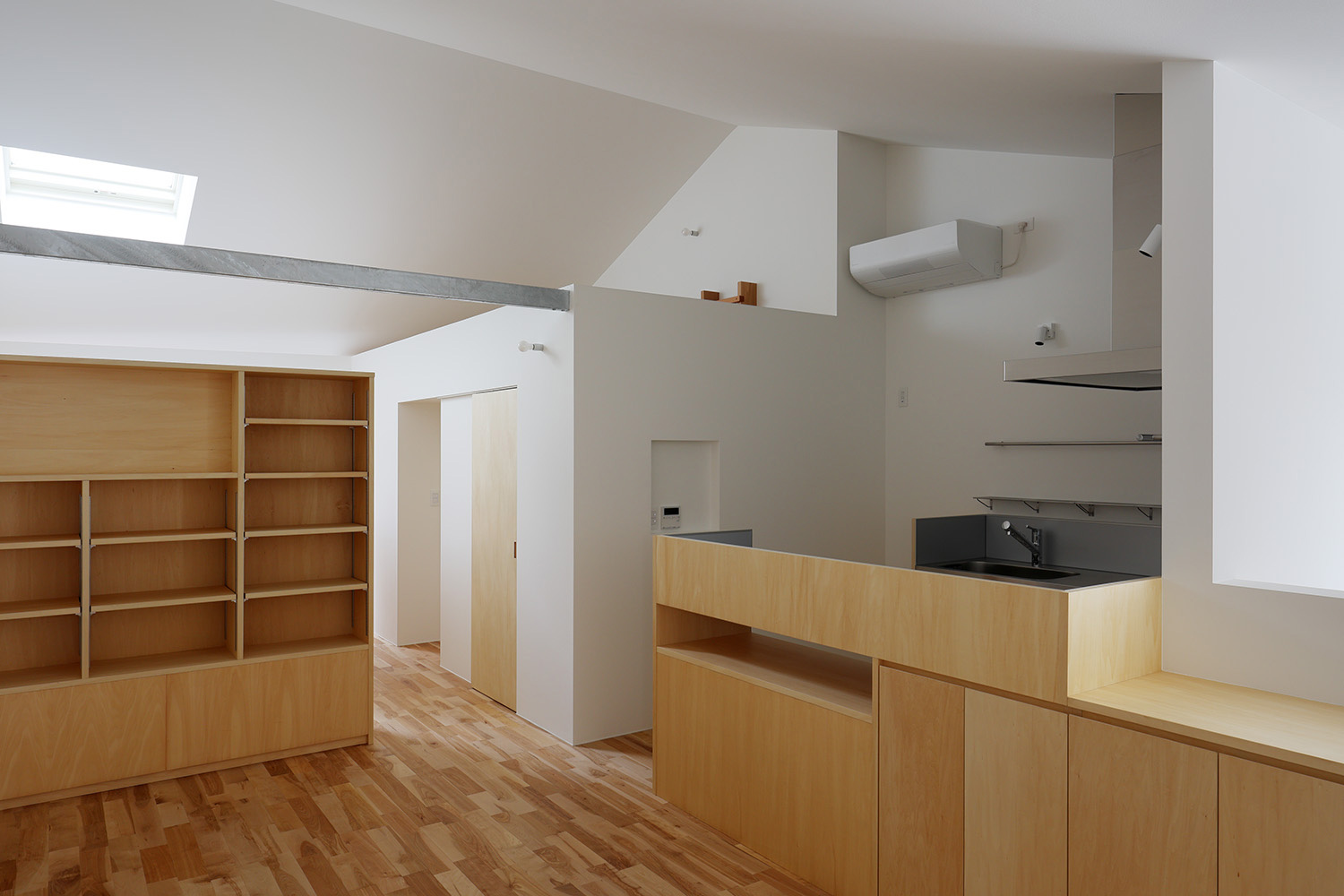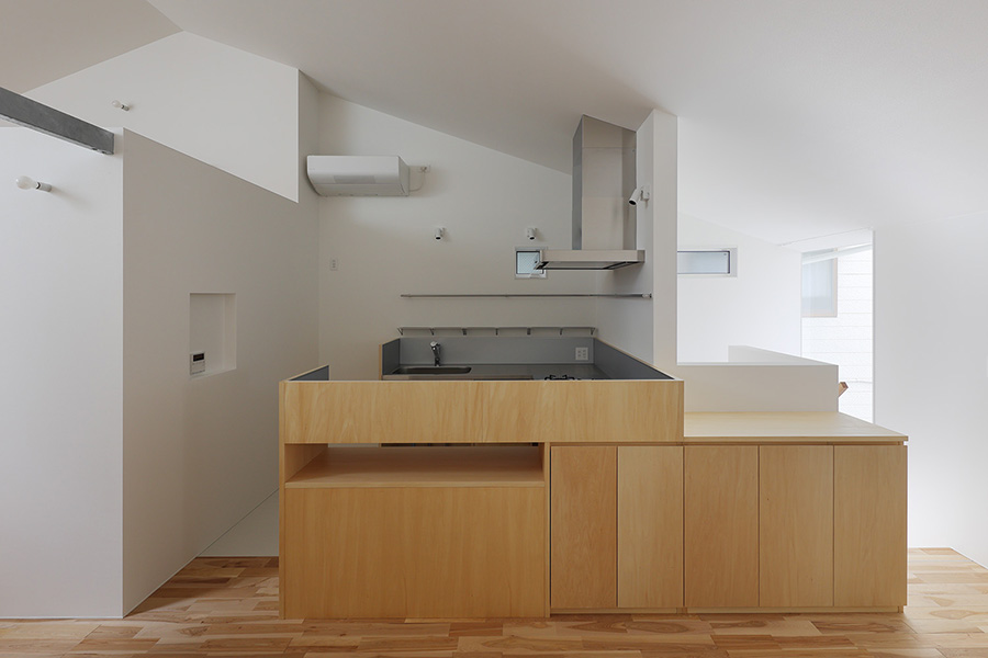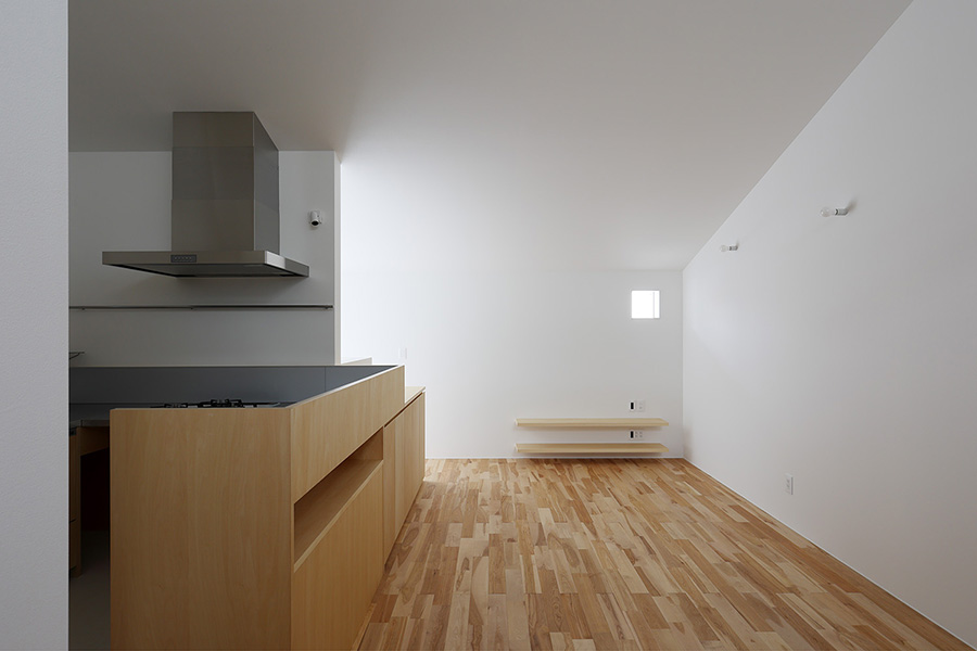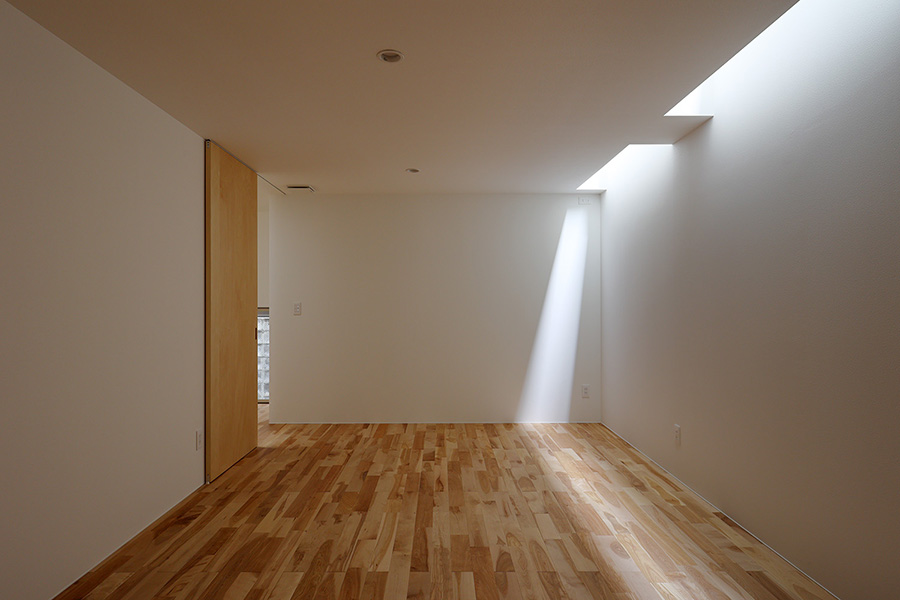隣家が接近しているため、十分な採光を確保するために、リビング・ダイニングを2階に、仕事場と寝室を1階に配置しています。