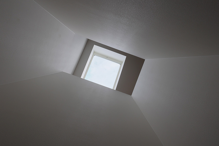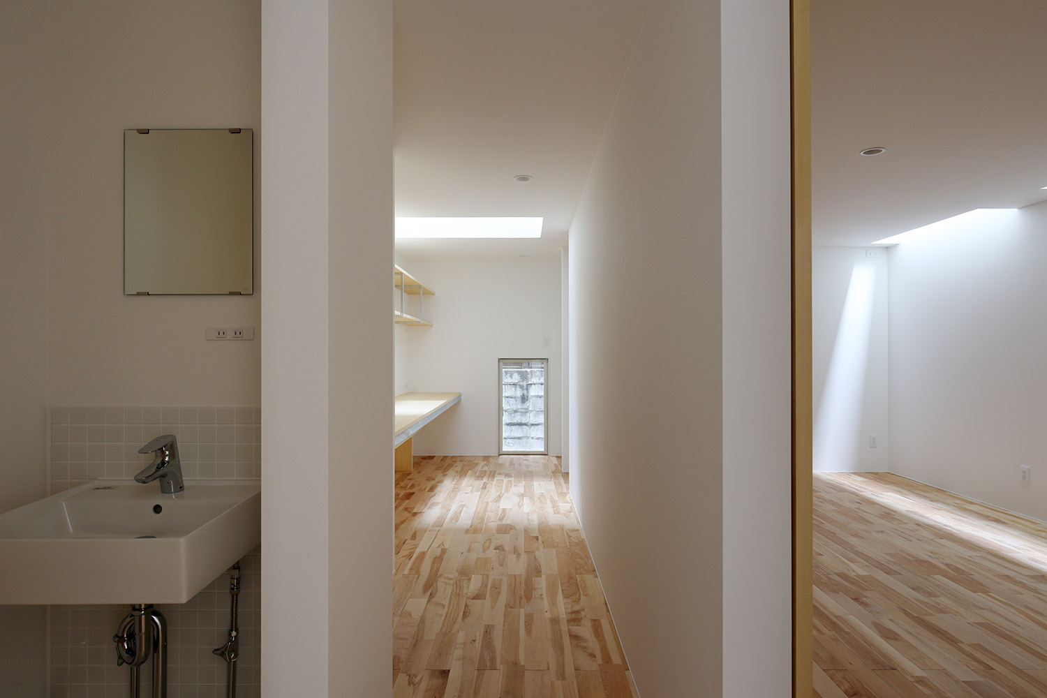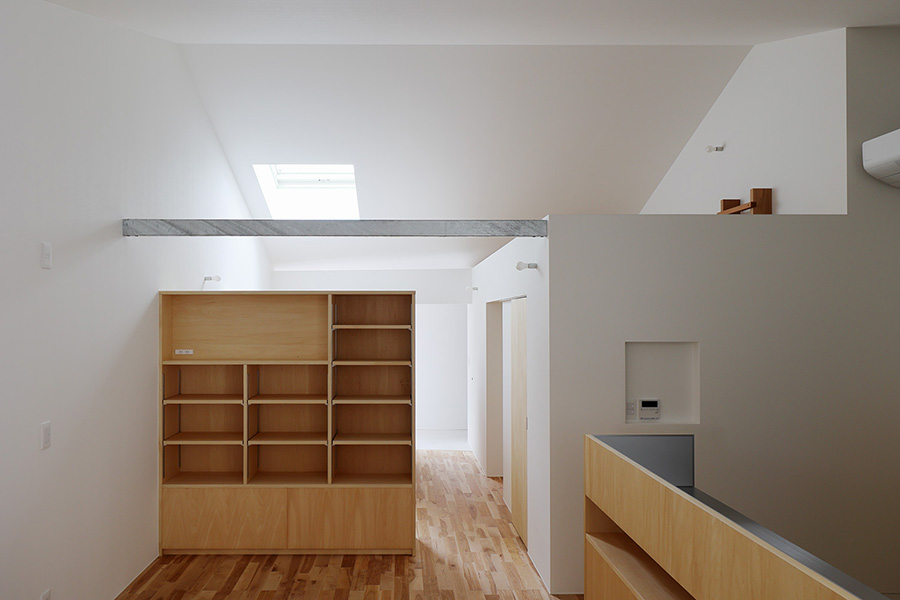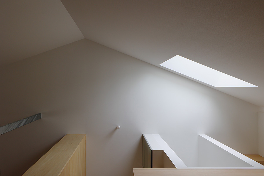 天窓を設けた吹き抜けが2階と1階を繋ぎ、仕事場にまで光を取り込みながら、両階の空間が互いに雰囲気を伝え合います。