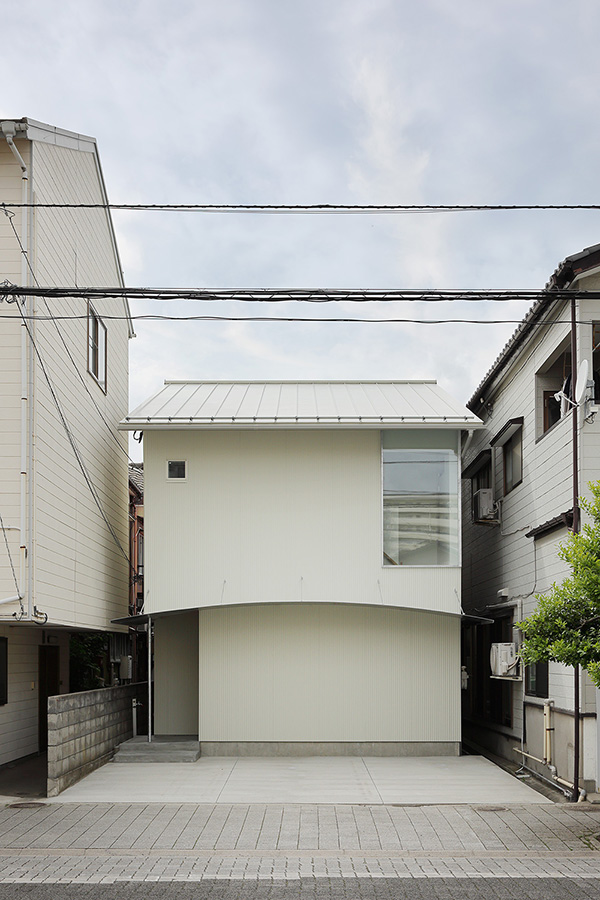 外観は、大きな窓と曲線的な庇で建物に主張を与えつつ、隣家の色調と調和させています。