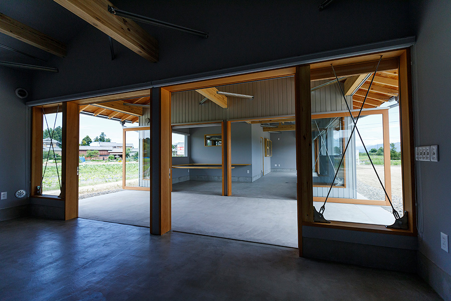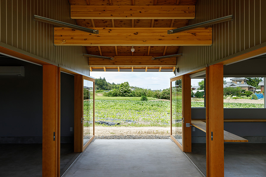 果物を加工する厨房と、将来的には直売とそのジャムを使ったメニューを提供する飲食スペース、また半屋外の土間を挟んで多目的に使える場所を用意しました。