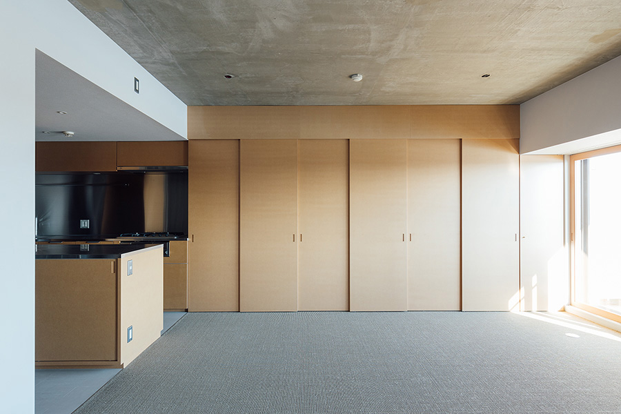 既存の間取りは、リビングの隣に和室が隣接していましたが、間仕切りを撤去し、キッチンからダイニング、リビングを一続きの広いワンルームに変更しました。