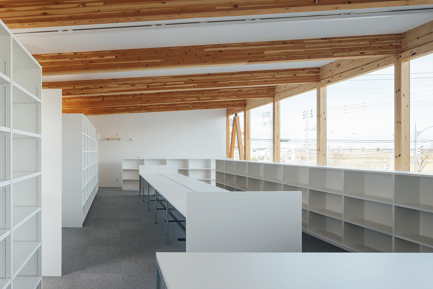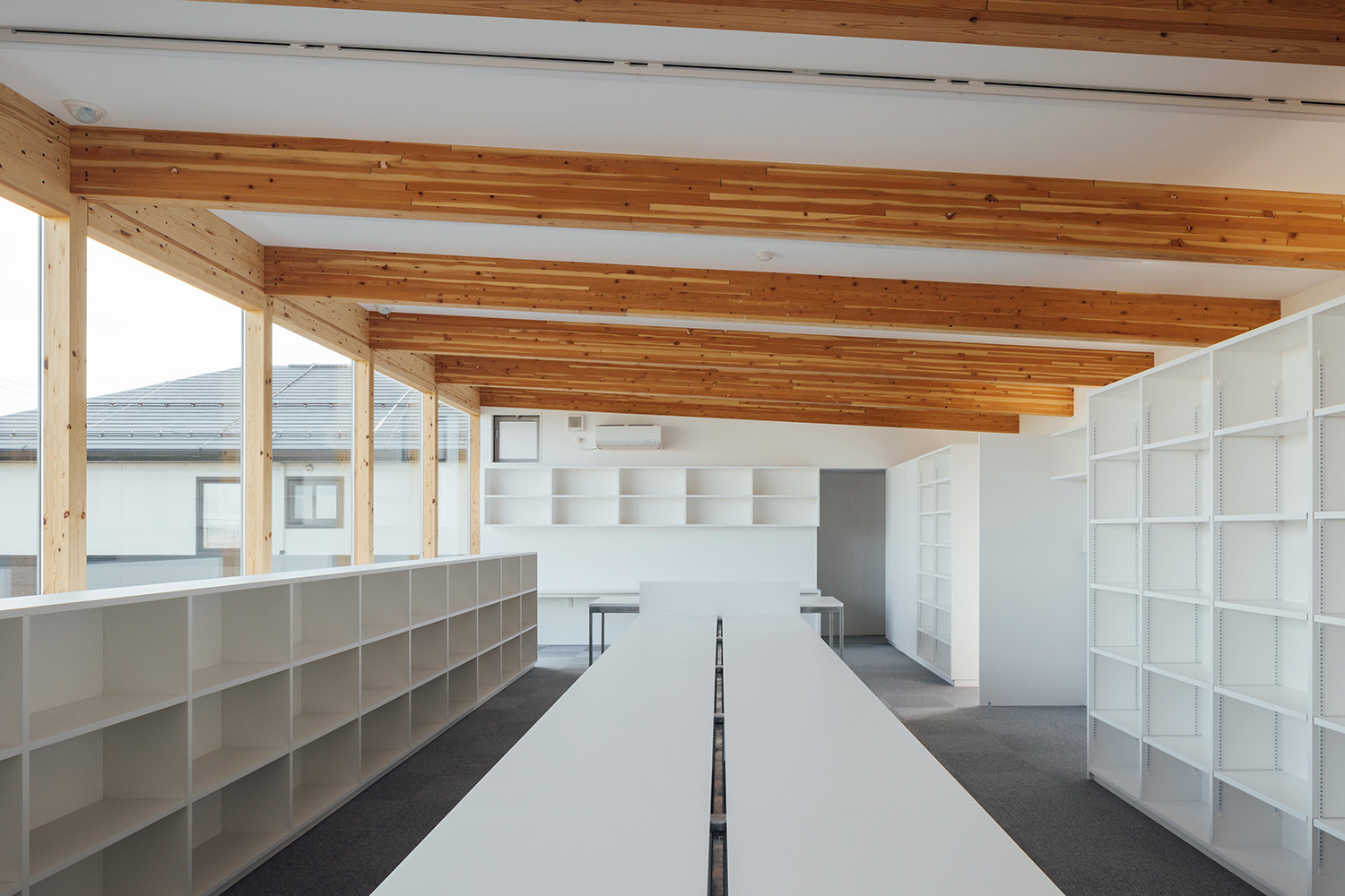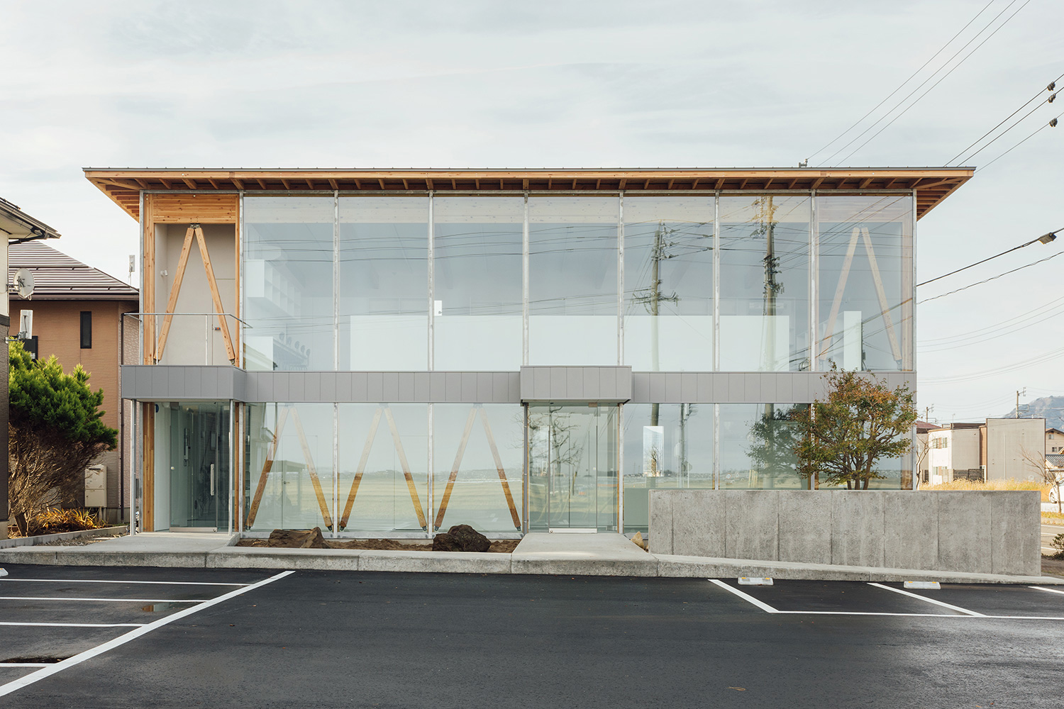 1階に受付・打合スペース・会議室・書庫、2階に事務所、という単純な構成の間取りの田んぼ側の北側1面をガラス張りにしました。