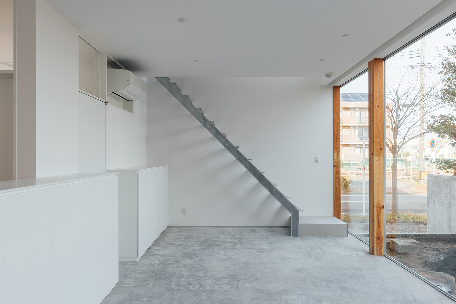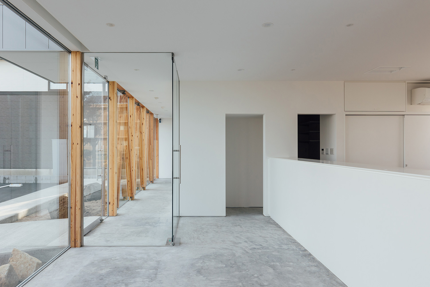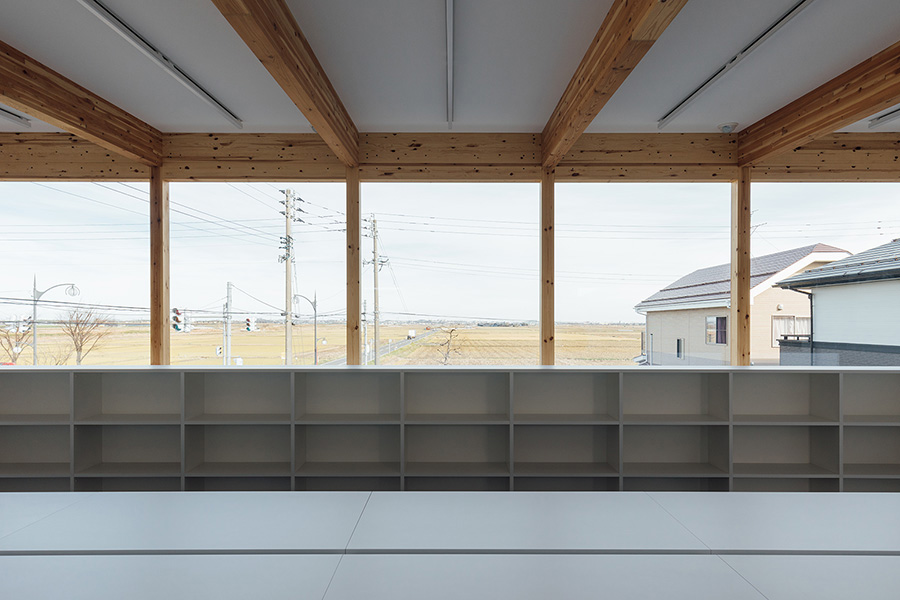 1階に受付・打合スペース・会議室・書庫、2階に事務所、という単純な構成の間取りの田んぼ側の北側1面をガラス張りにしました。