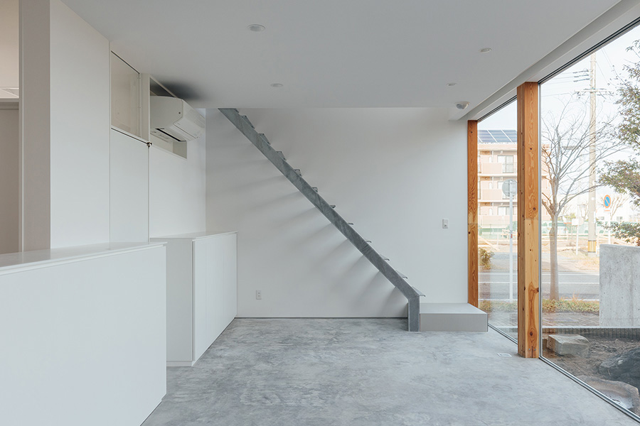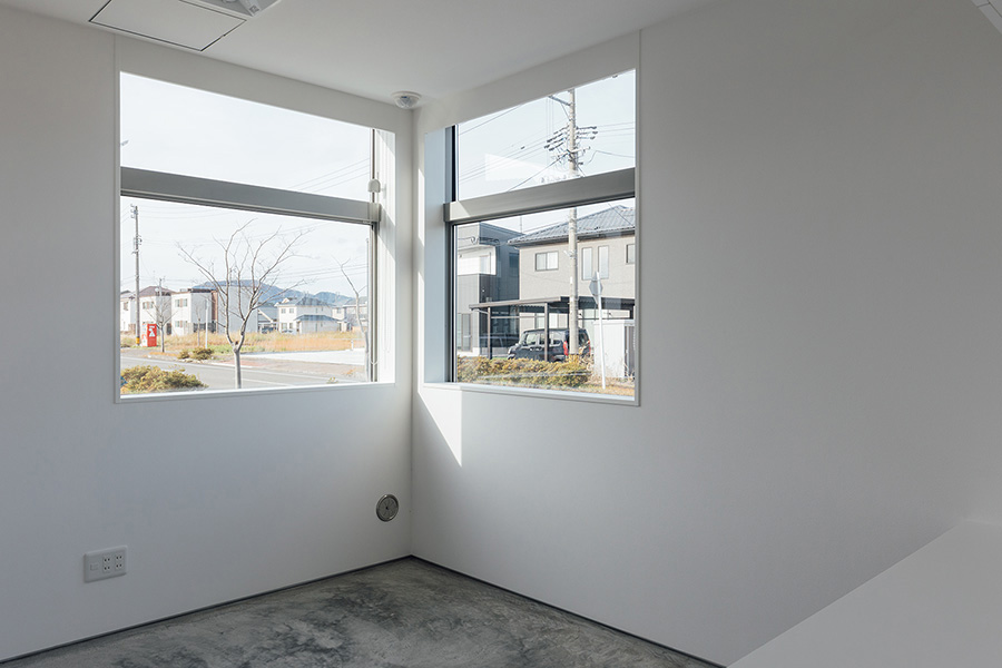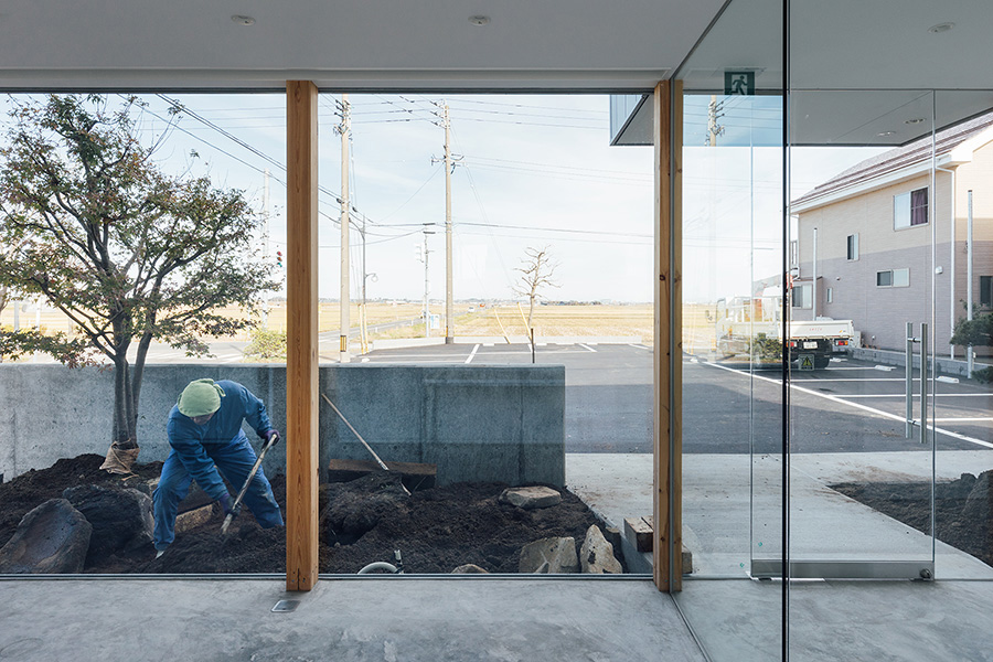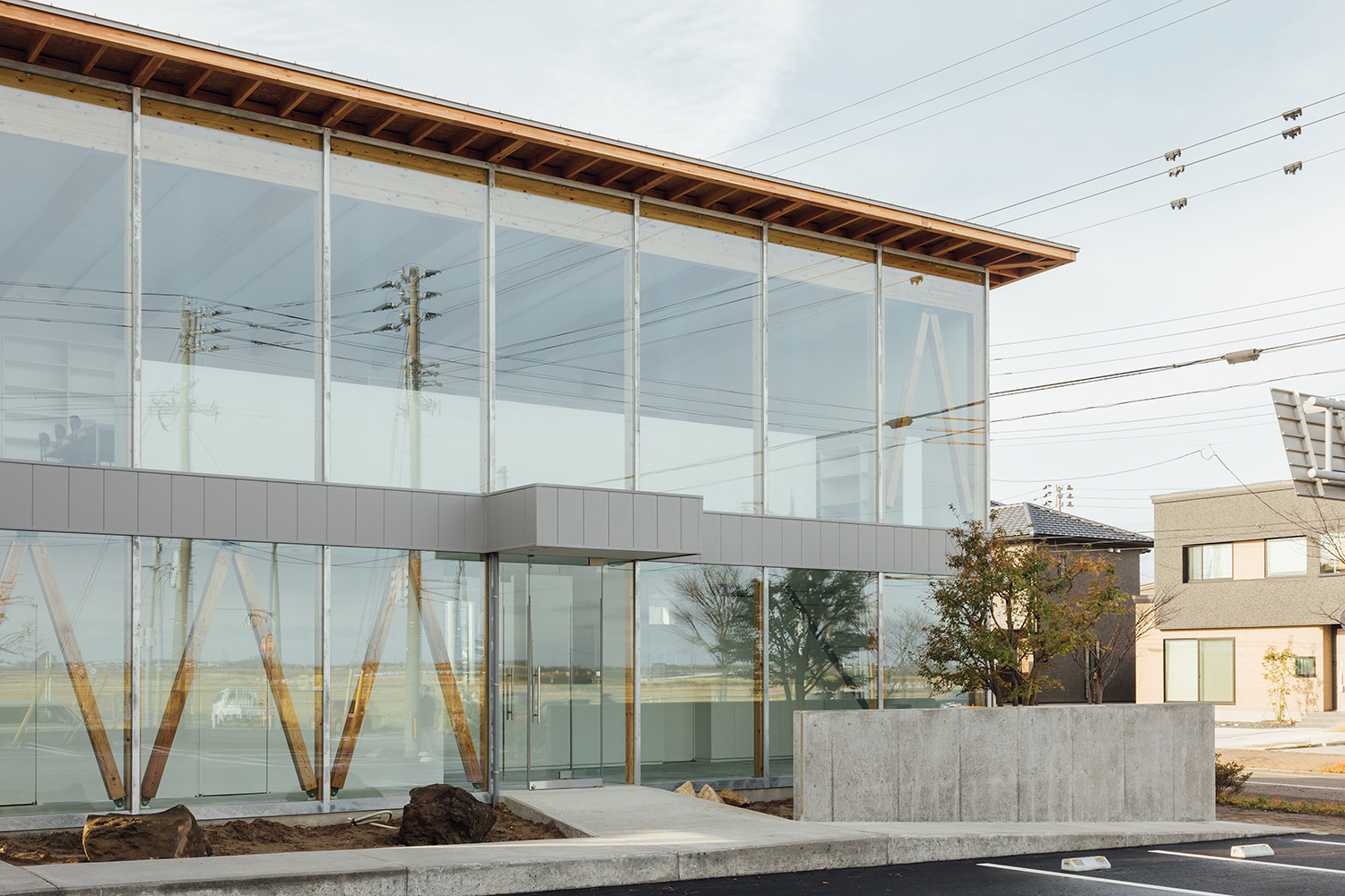 住宅地の端、田んぼが見渡せるロケーションに建つ道路の維持管理を行う会社の社屋です。