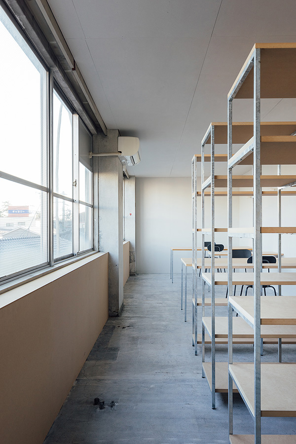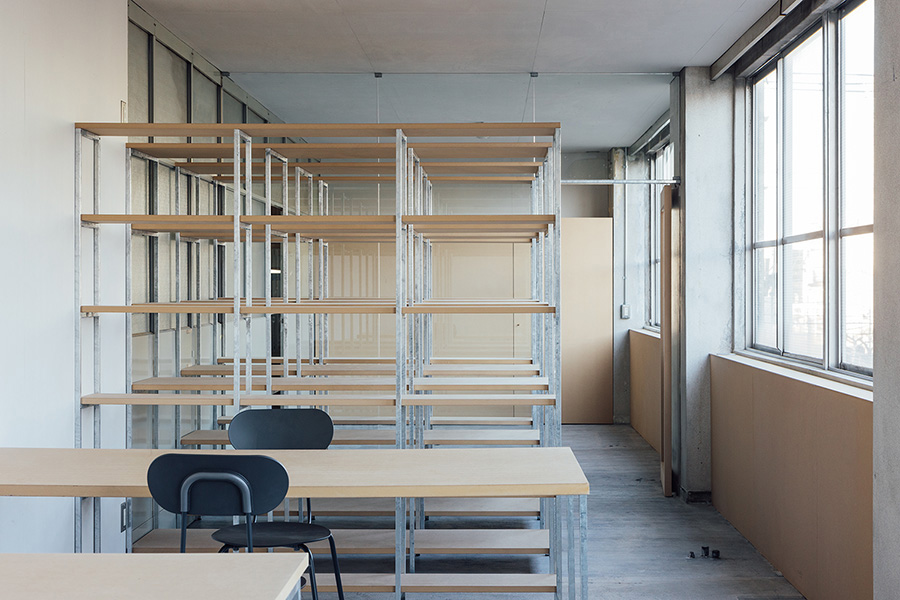 入口側に打合室を、奥に執務室を設けています。広い部屋とはいえ、限られた空間では息苦しさがあるため、部屋の間はガラスで仕切り、視覚的に部屋同士は一体的にして並べた本棚を2つの場所を緩衝させる役割として利用します。